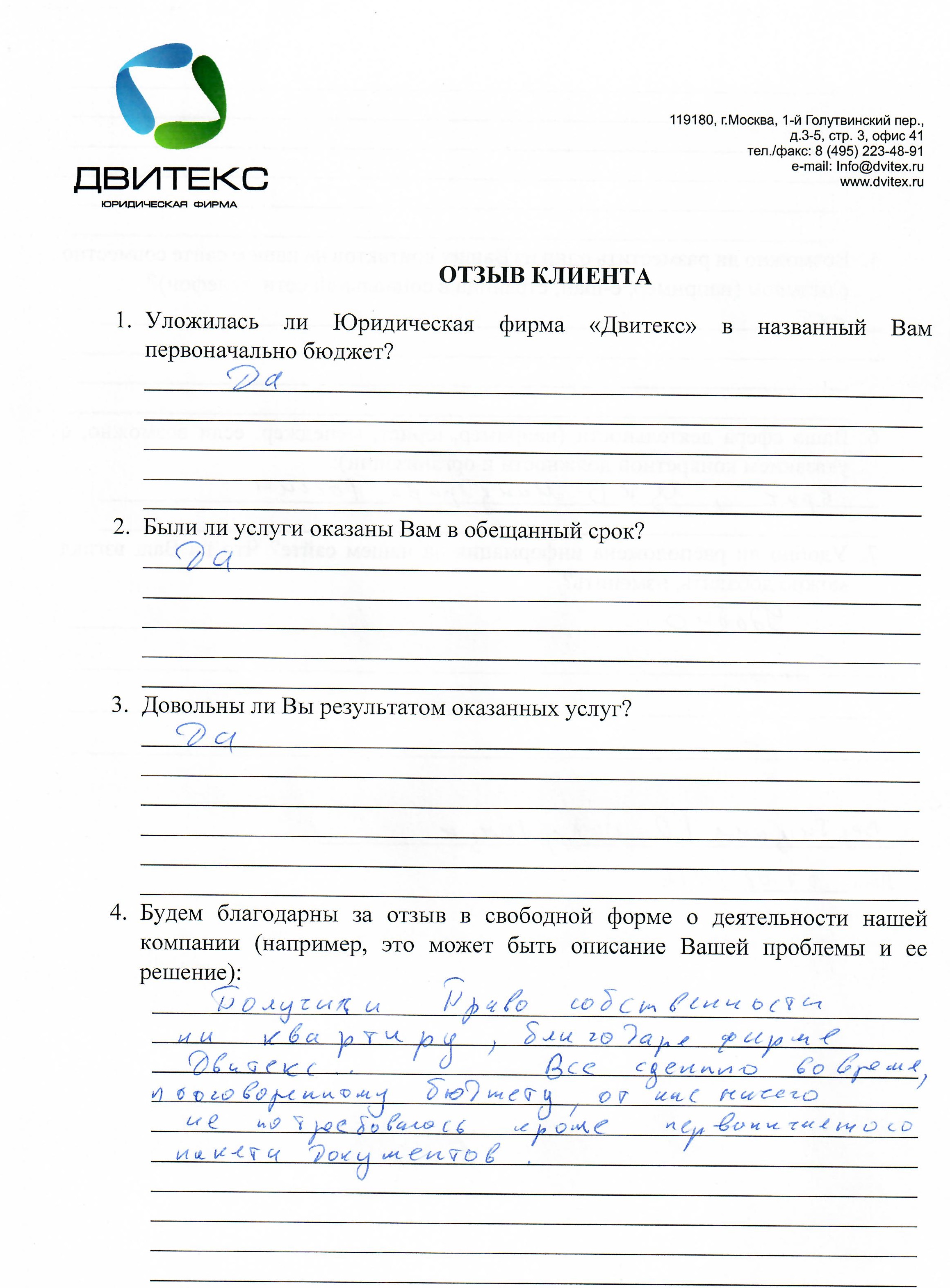 Получили право собственности на квартиру, благодаря фирме Двитекс. Все сделано вовремя по оговоренному бюджету, от нас ничего не требовалось, кроме первоначального пакета документов.