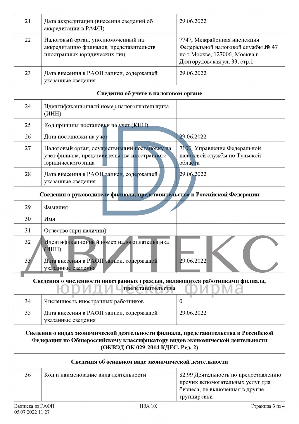 Юристы Юридической фирмы "Двитекс" после получения первичной информации о планируемой коммерческой деятельности Клиента в России предложили наиболее оптимальный в данной ситуации вариант ведения бизнеса - открытие филиала китайской компании в РФ. Мы оформили все необходимые документы, сопровождали клиента в течение всей процедуры аккредитации: консультировали Клиента при получении необходимых документов в уполномоченных органах в Китае, готовили, подавали и получали документы самостоятельно по доверенности, без участия Клиента, представляли интересы доверителя в МИФНС, Росстате и фондах.