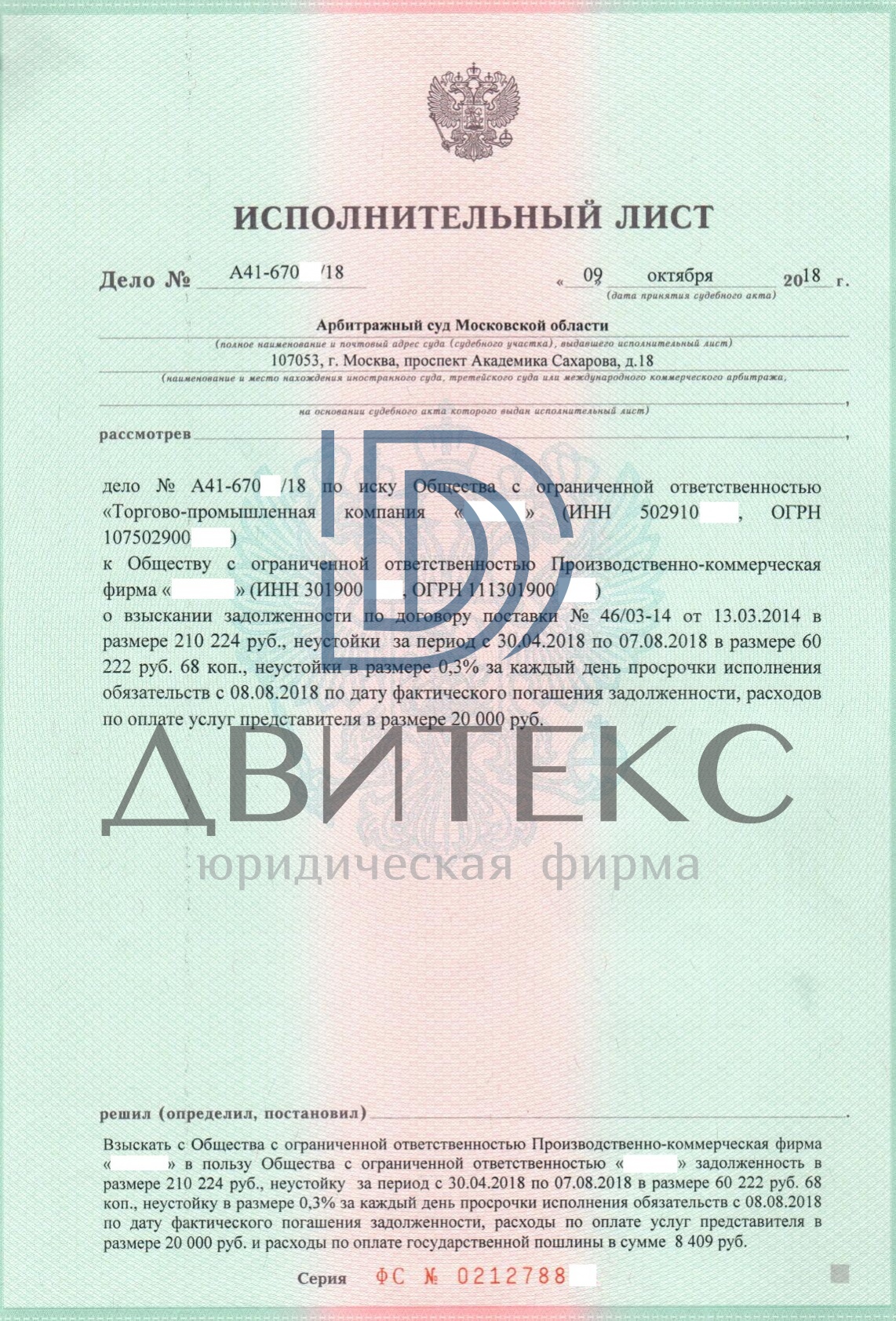 Сотрудники Юридическая фирма "Двитекс" рассчитали неустойку за весь период просрочки, подготовили исковое заявление о взыскании задолженности и все необходимые документы, представили интересы клиента в арбитражном суде и в переговорах с должником. Результатом нашей работы явилось вынесение судом положительного решения (требования удовлетворены в полном объеме). В дальнейшем деньги были взысканы нашими юристами фактически с должника.
