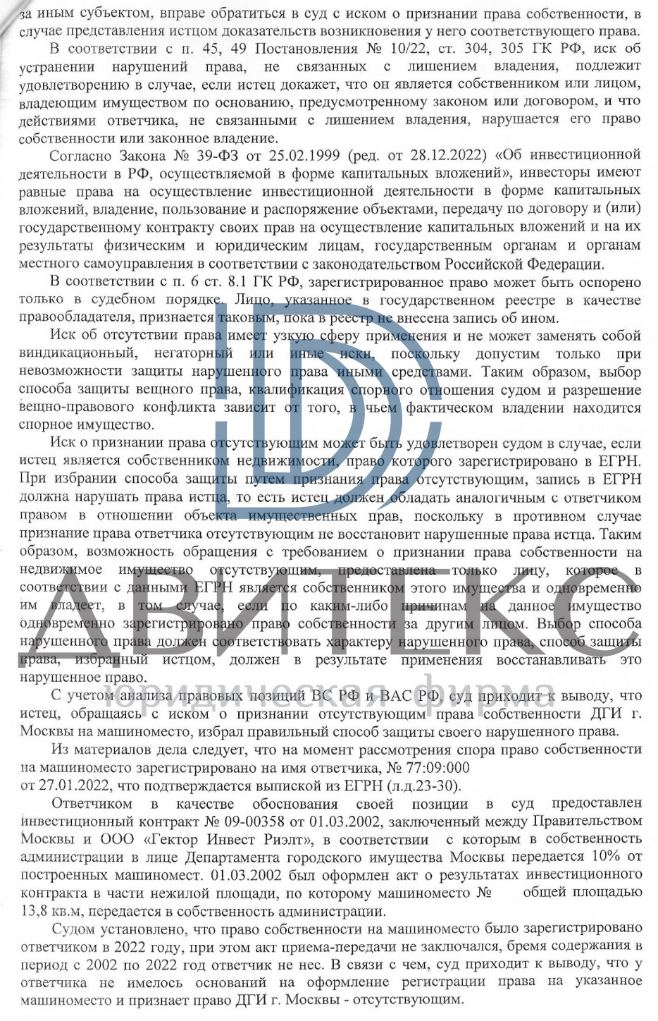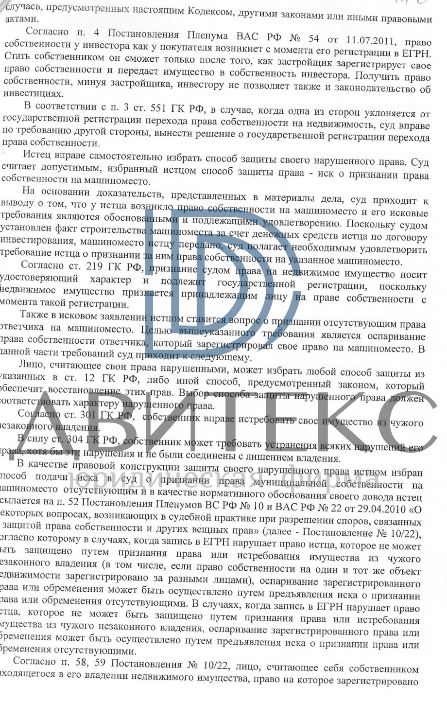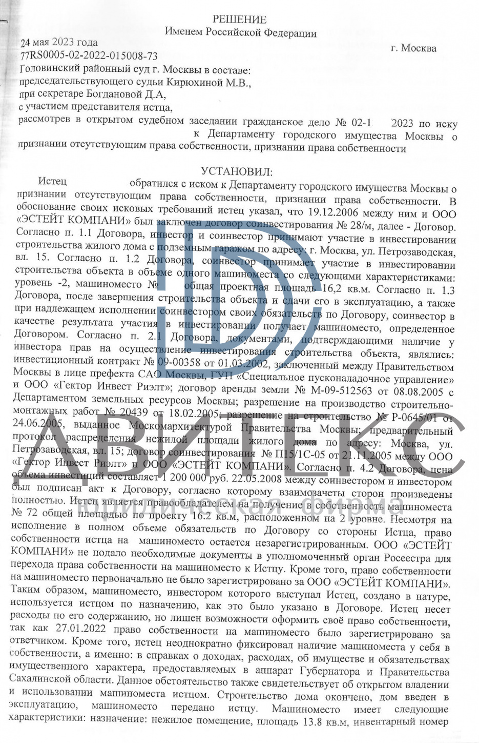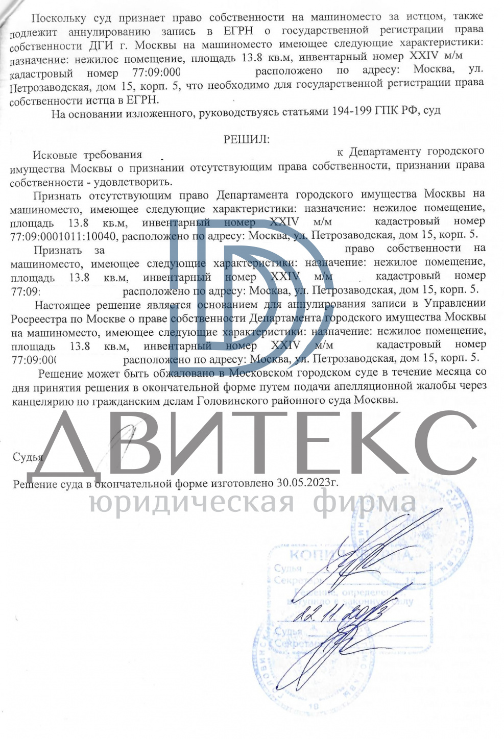 Юристы «Двитекс» собрали необходимые документы, представляли интересы доверителей в суде. Результатом нашей работы явилось вынесение судом решений о признании права собственности доверителей на машино-места. В дальнейшем наши сотрудники зарегистрировали право собственности доверителей на машино-места.