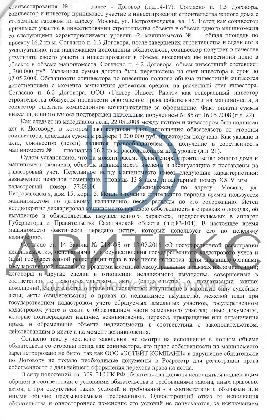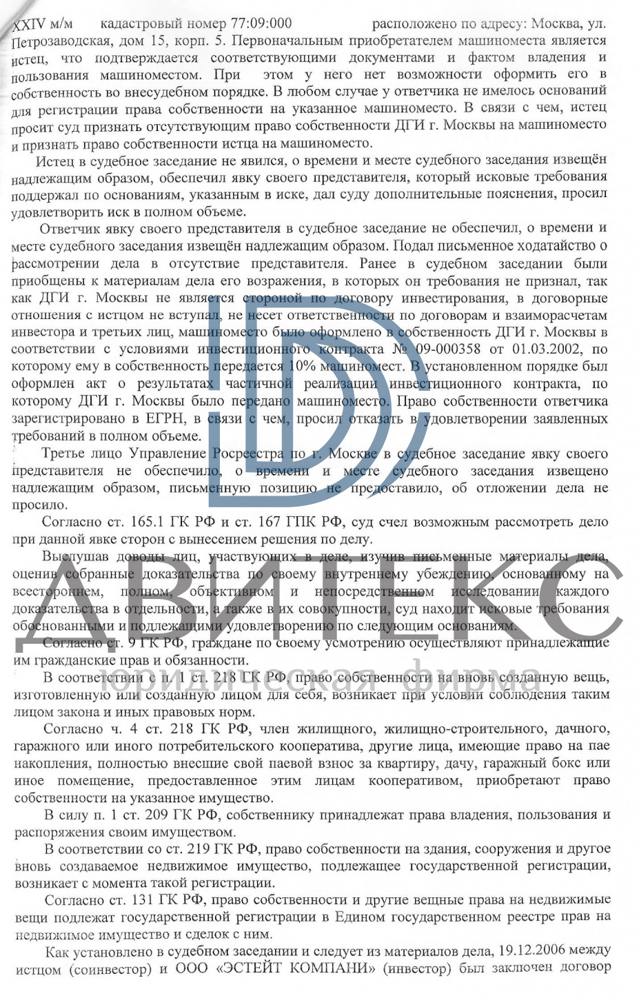 Доверители заключили с ООО «ЭСТЕЙТ КОМПАНИ» договоры соинвестирования в строительство с целью приобретения права собственности на машиноместа по адресу: г. Москва, ул. Петрозаводская, вл. 15. Строительство было завершено, однако застройщик не подал необходимые документы в уполномоченный орган Росреестра для перехода права собственности на машино-места к доверителям. Доверители обратились в Юридическую фирму "Двитекс" за правовой помощью по оформлению права собственности на машиноместа.