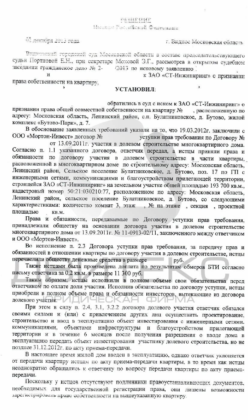 Клиенты заключили договоры участия в долевом строительстве для покупки квартир в строящемся микрорайоне «Бутово парк» и «Бутово парк 2». Строительство было завершено, однако застройщик не зарегистрировал право собственности дольщиков. Клиенты обратились с просьбой признать право собственности на квартиры через суд.