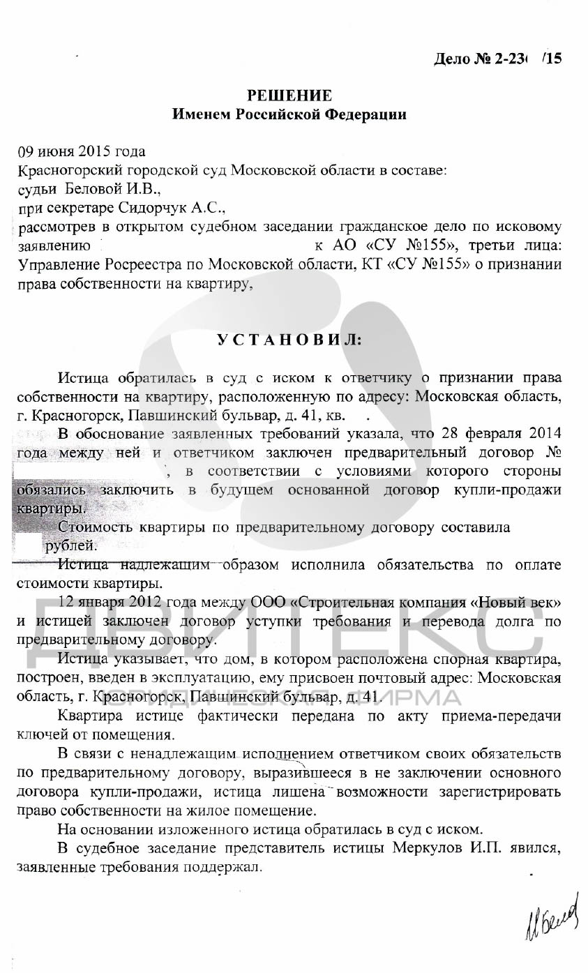 Клиенты заключили предварительные договоры купли-продажи квартир в Павшинской пойме, г. Красногорск, Павшинский бульвар, дом 41 (застройщик: ЗАО «СУ - № 155»). Клиенты получили ключи, проживают в квартире, однако застройщик СУ № 155 не оформил право собственности дольщиков на квартиры. Клиенты обратились с просьбой оформить право собственности на квартиры.
