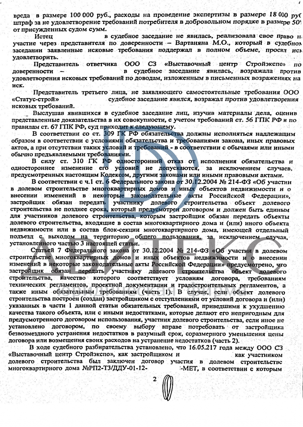 Результат нашей работы по взысканию стоимости строительных недостатков с ООО "ВЦ СТРОЙЭКСПО" в Лефортовском районном суде города Москвы: