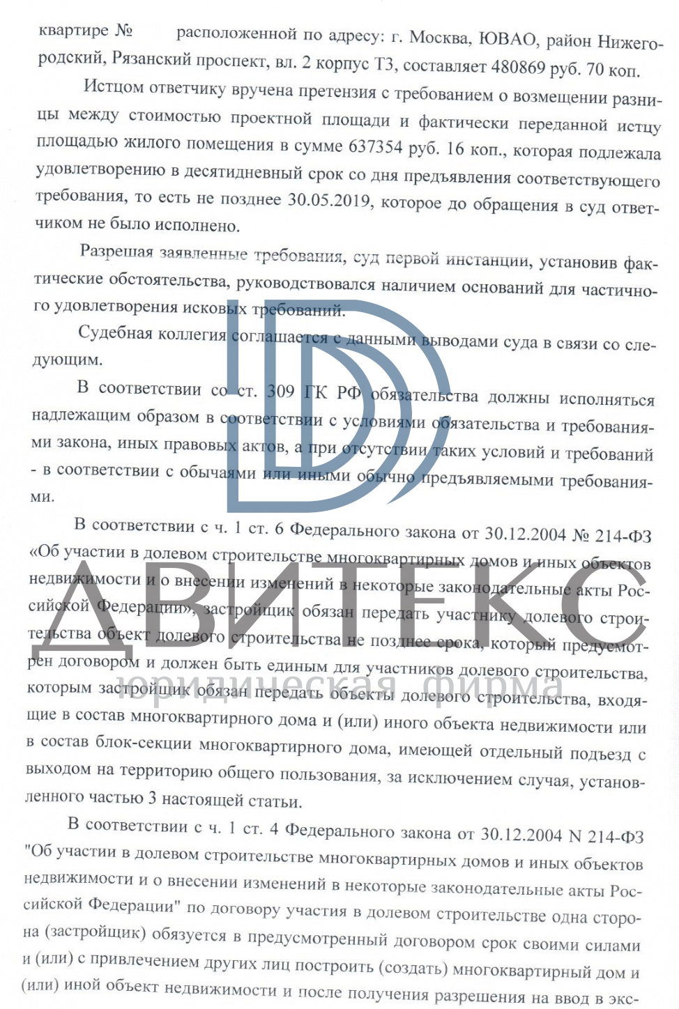Юристы ООО Юридическая фирма "Двитекс" организовали проведение осмотра объекта строительно-техническим специалистом, получили заключение специалиста, подготовили необходимые документы и обратились в суд, представили интересы клиента в суде. Результатом рассмотрения дела явилось взыскание в пользу клиента стоимости выявленных строительных недостатков, уменьшение цены ДДУ соразмерно выявленным недостаткам, компенсации морального вреда, штрафа, а также судебных расходов с застройщика ООО "ВЦ СТРОЙЭКСПО" (ЖК "Среда"). Всего взыскано 1 368 223,86 руб. В дальнейшем наши юристы защитили интересы доверителя в суде апелляционной и кассационной инстанции. Деньги поступили клиенту на счет от застройщика.
