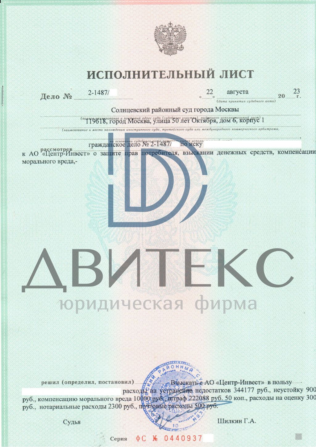 Юристы ООО Юридическая фирма "Двитекс" организовали проведение осмотра объекта строительно-техническим специалистом, получили заключение специалиста, подготовили необходимые документы и обратились в суд, представили интересы клиента в суде. Результатом рассмотрения дела явилось взыскание в пользу клиента стоимости выявленных строительных недостатков, компенсации морального вреда, штрафа, а также судебных расходов с застройщика АО "МОСКОВСКИЙ ГОРОДСКОЙ ЦЕНТР ПРОДАЖИ НЕДВИЖИМОСТИ" (ЖК "Фестиваль парк"). Всего взыскано 699 065,50 руб. Деньги поступили клиенту на счет от застройщика.