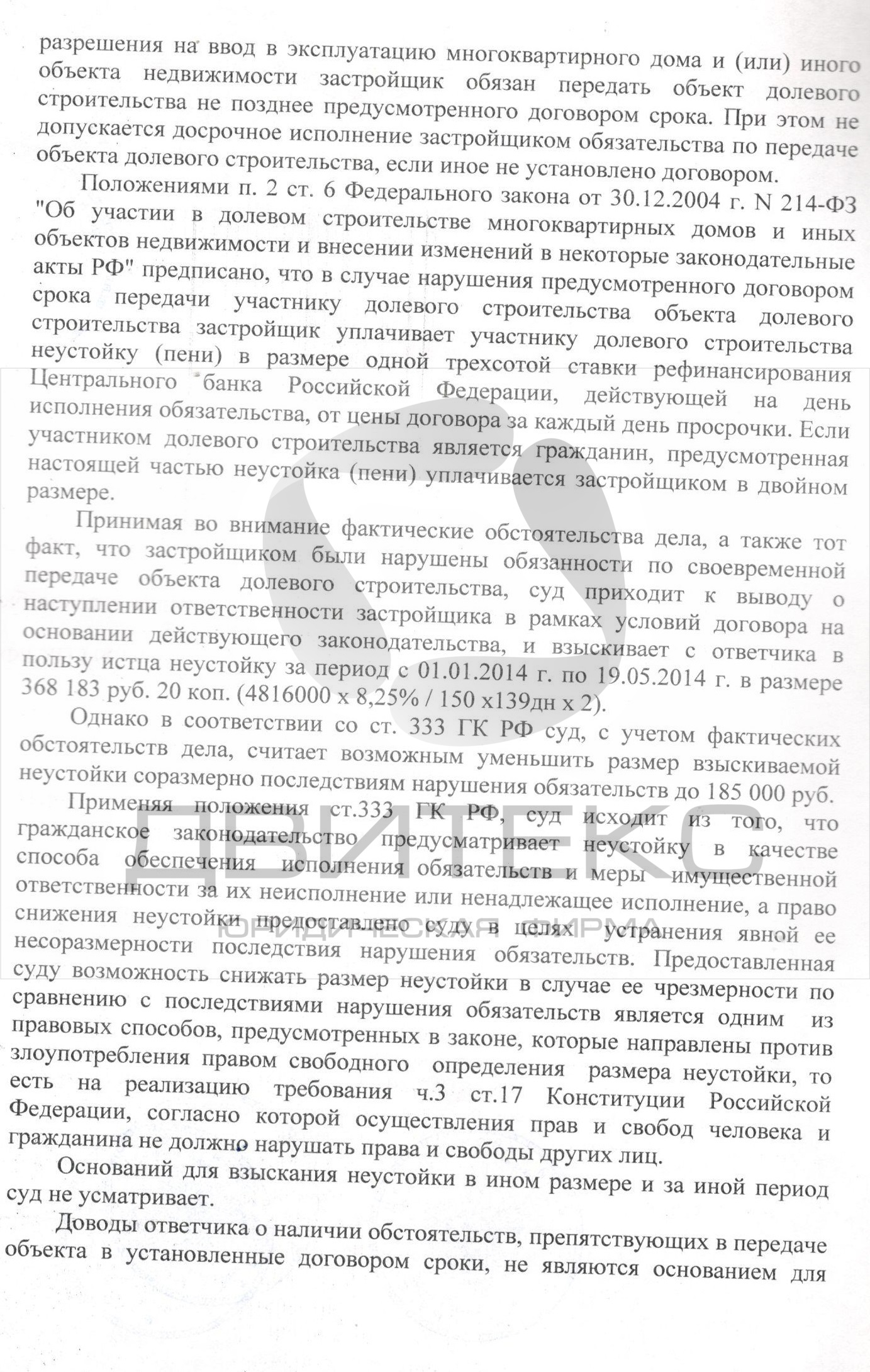 Неустойка: 185 000 рублей