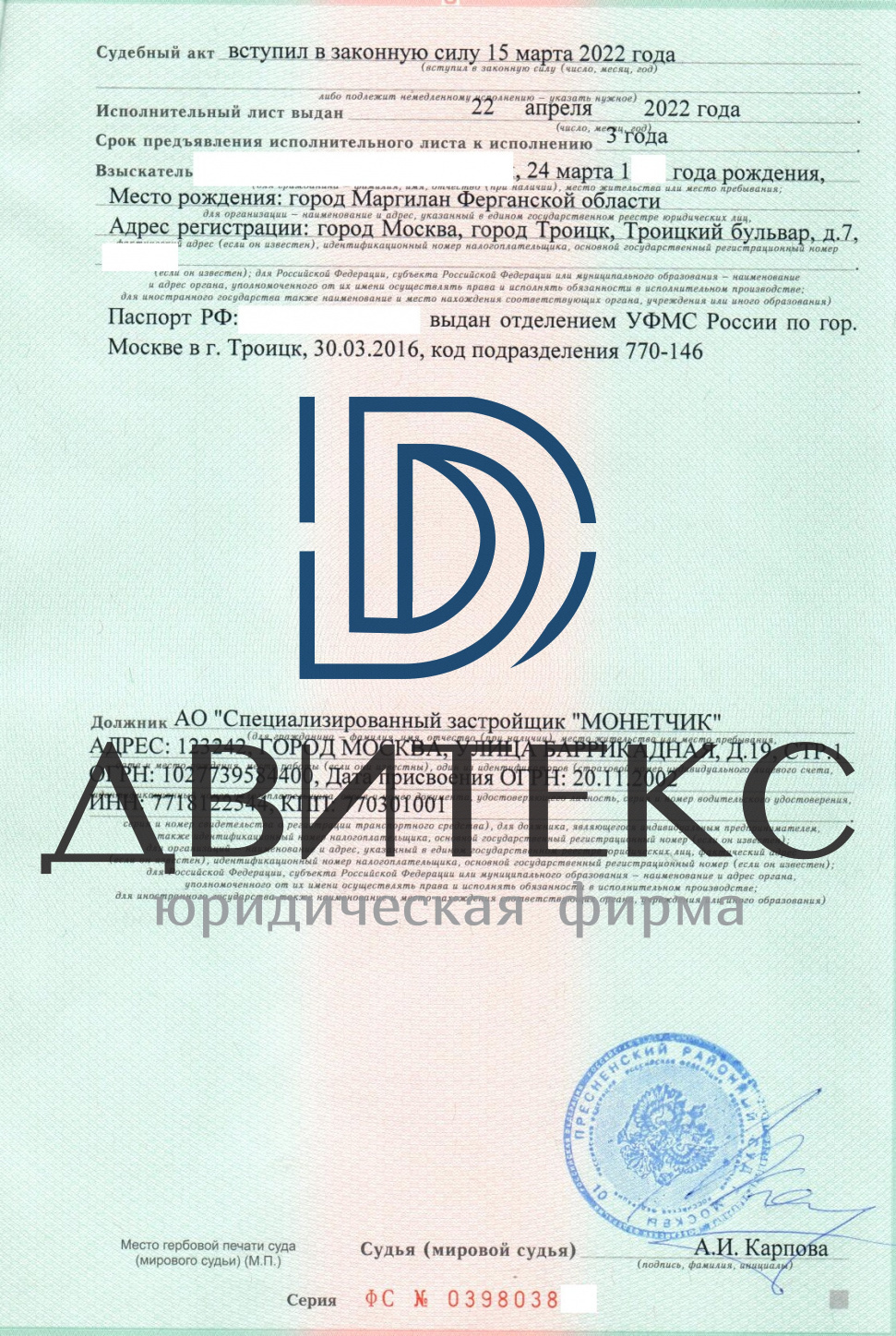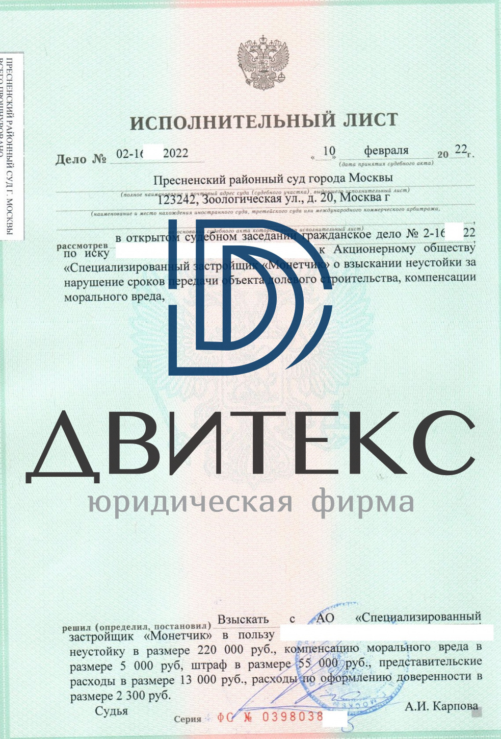 Специалисты Юридической фирмы "Двитекс" подготовили все необходимые документы и защитили интересы клиента в суде. Результатом нашей работы явилось взыскание судом в пользу клиента неустойки, штрафа, компенсации морального вреда, а также судебных расходов с застройщика АО "Монетчик", ГК ПИК (ЖК "Академика Павлова"). Всего взыскано 295 300 руб. Деньги поступили клиенту на счет от застройщика.