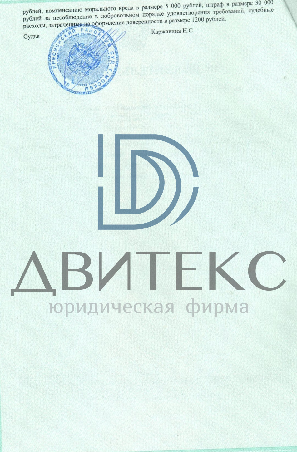 Специалисты Юридической фирмы "Двитекс" подготовили все необходимые документы и защитили интересы клиента в суде. Результатом нашей работы явилось взыскание судом в пользу клиента неустойки, штрафа, компенсации морального вреда, а также судебных расходов с застройщика АО "Монетчик", ГК ПИК (ЖК "Академика Павлова"). Всего взыскано 472 400 руб. Деньги поступили клиенту на счет от застройщика.