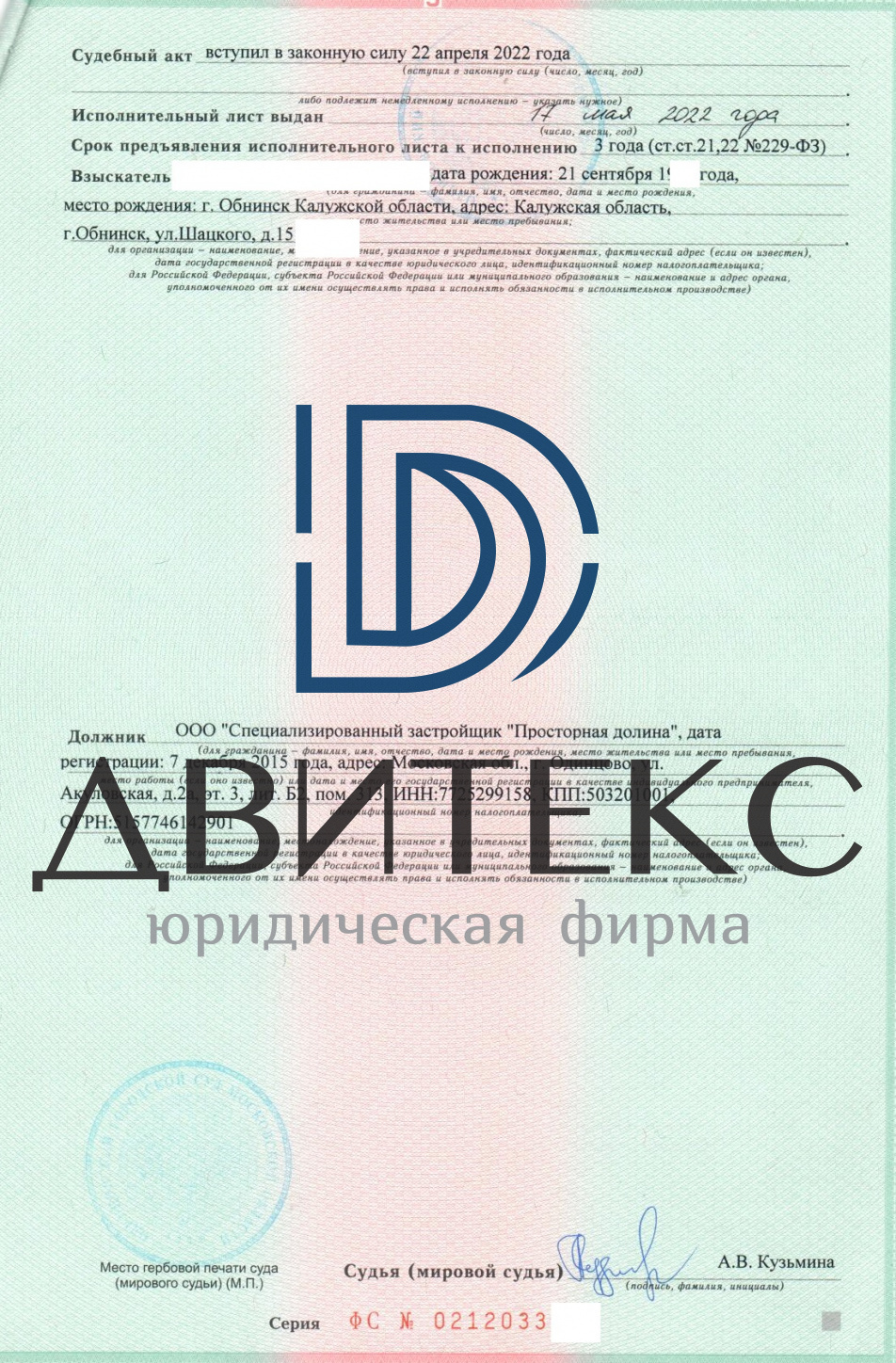Специалисты Юридической фирмы "Двитекс" подготовили все необходимые документы и защитили интересы клиента в суде. Результатом нашей работы явилось взыскание судом в пользу клиента неустойки, штрафа, компенсации морального вреда, а также судебных расходов с застройщика ООО "СЗ ПРОСТОРНАЯ ДОЛИНА" (ЖК "Одинград"). Всего взыскано 183 3000 руб. Деньги поступили клиенту на счет от застройщика.