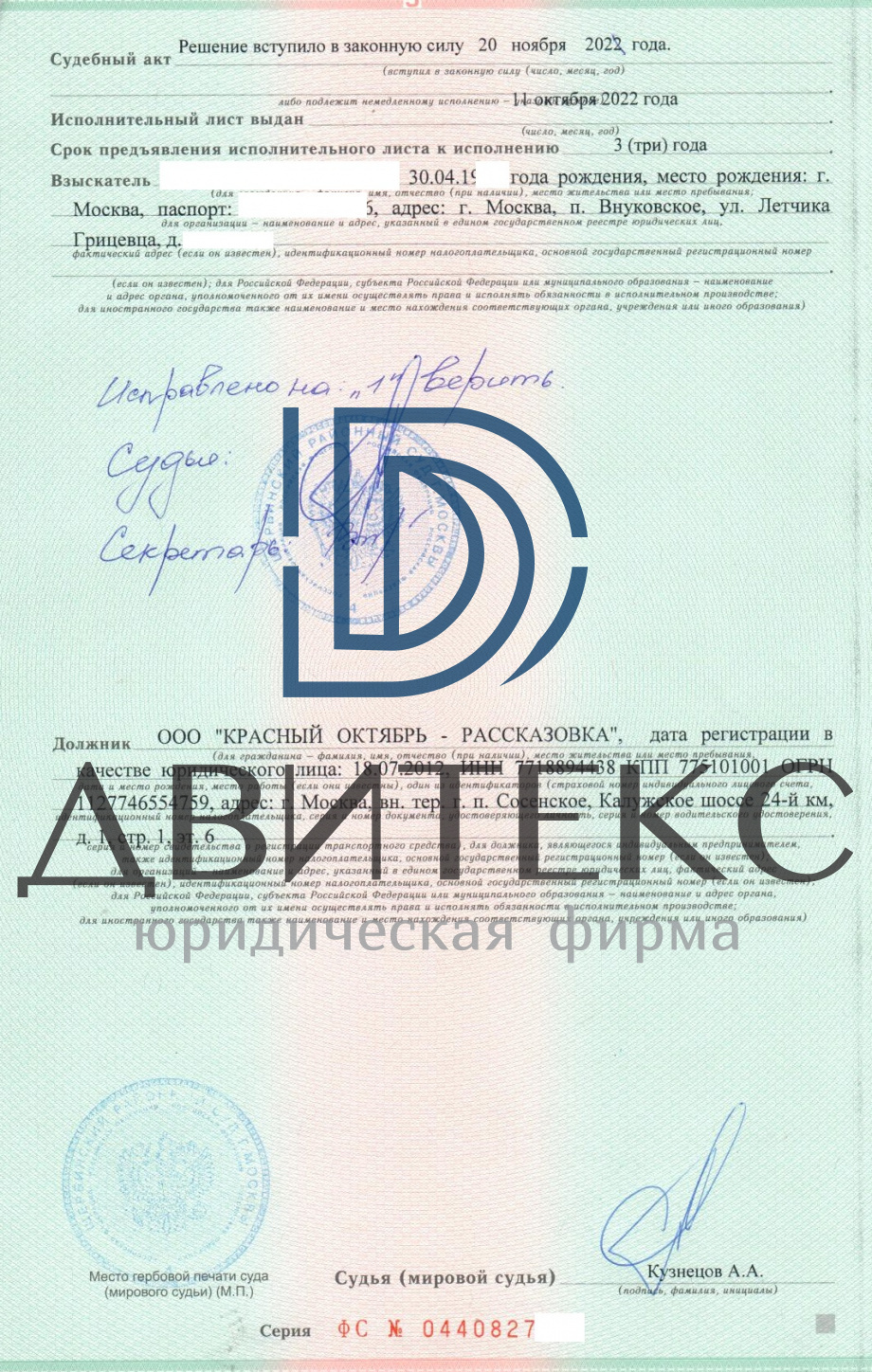Юристы ООО Юридическая фирма "Двитекс" подготовили необходимые документы и обратились в суд, представили интересы клиентов в суде. Результатом рассмотрения дела явилось взыскание в пользу клиента неустойки, штрафа, компенсации морального вреда, а также судебные расходы с застройщика ООО "Красный Октябрь-Рассказовка" (ЖК "Рассказово"). Всего взыскано 560 000 руб. Деньги поступили клиенту на счет от застройщика.