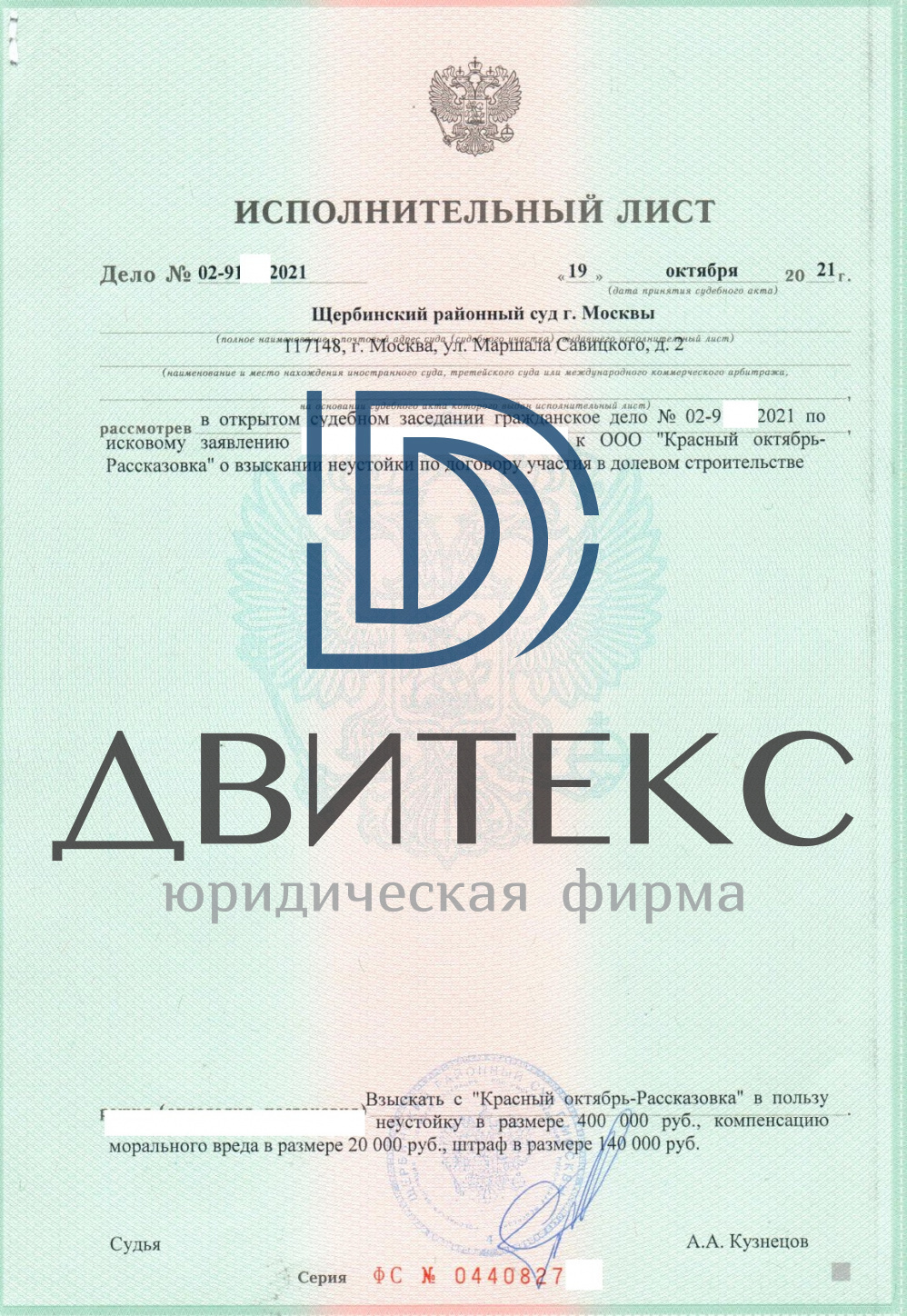 Результат нашей работы по взысканию неустойки с ООО "Красный Октябрь-Рассказовка" в Щербинском районном суде г. Москвы: