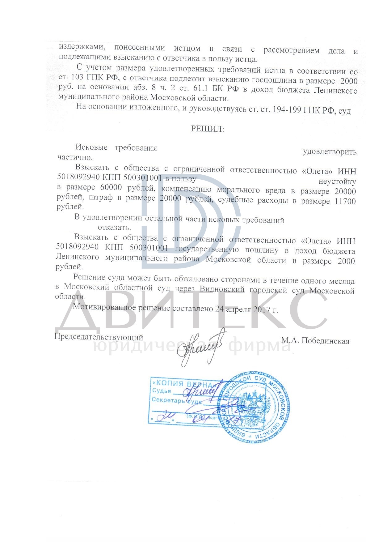 Юристы ООО Юридическая фирма «Двитекс» подготовили необходимые документы и обратились в суд, представили интересы клиента в суде. Суд решил взыскать неустойку с ООО Олета, всего взыскано 111 700 рублей (60 % от заявленных сумм).