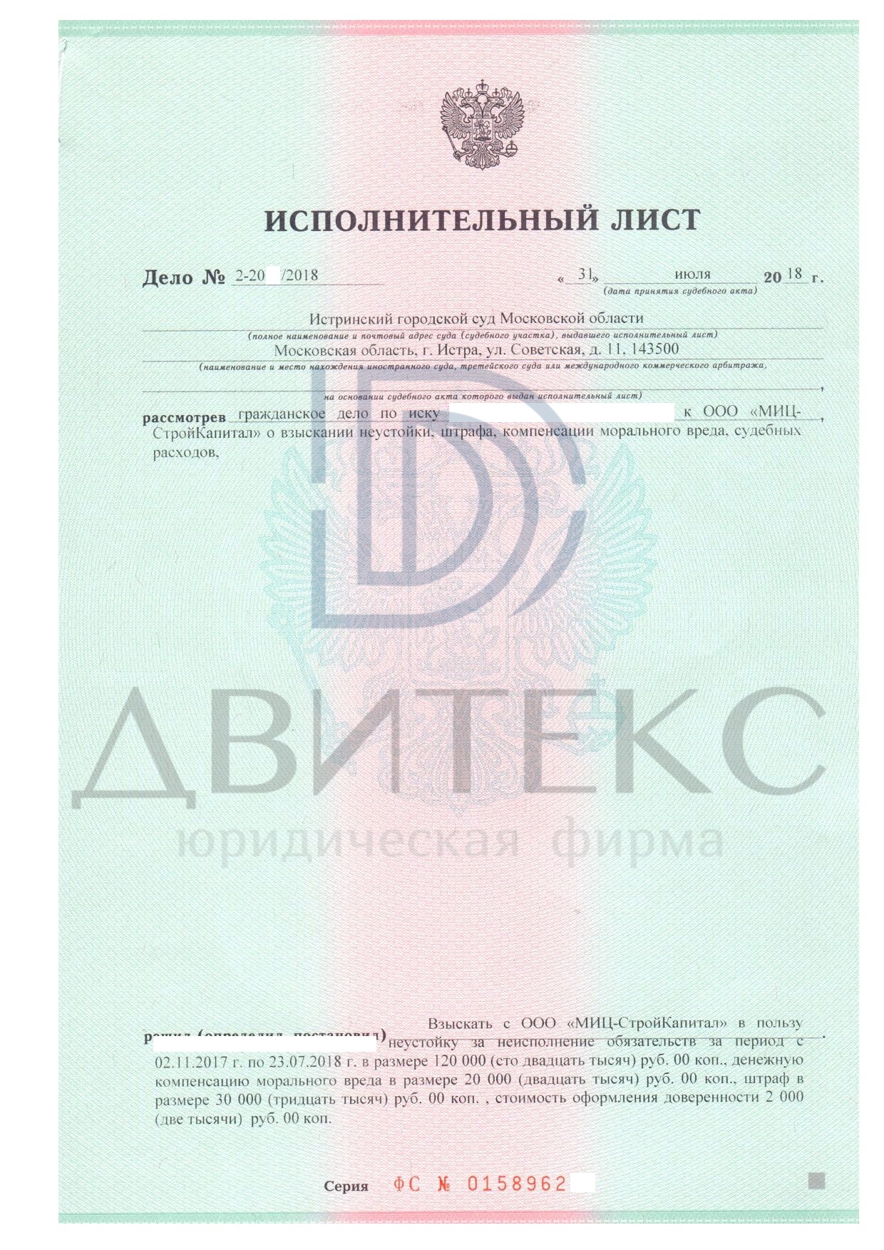 Юристы ООО Юридическая фирма «Двитекс» подготовили необходимые документы и обратились в суд, представили интересы клиента в суде. Результатом обращения в суд было взыскание неустойки в размере 120 000 рублей, штрафа в сумме 30 000 рублей, морального вреда в размере 20 000 рублей, а также судебных расходов в сумме 2 000 рублей и расходов по оформлению доверенности в размере 2 000 рублей с ООО «МИЦ-СтройКапитал».
