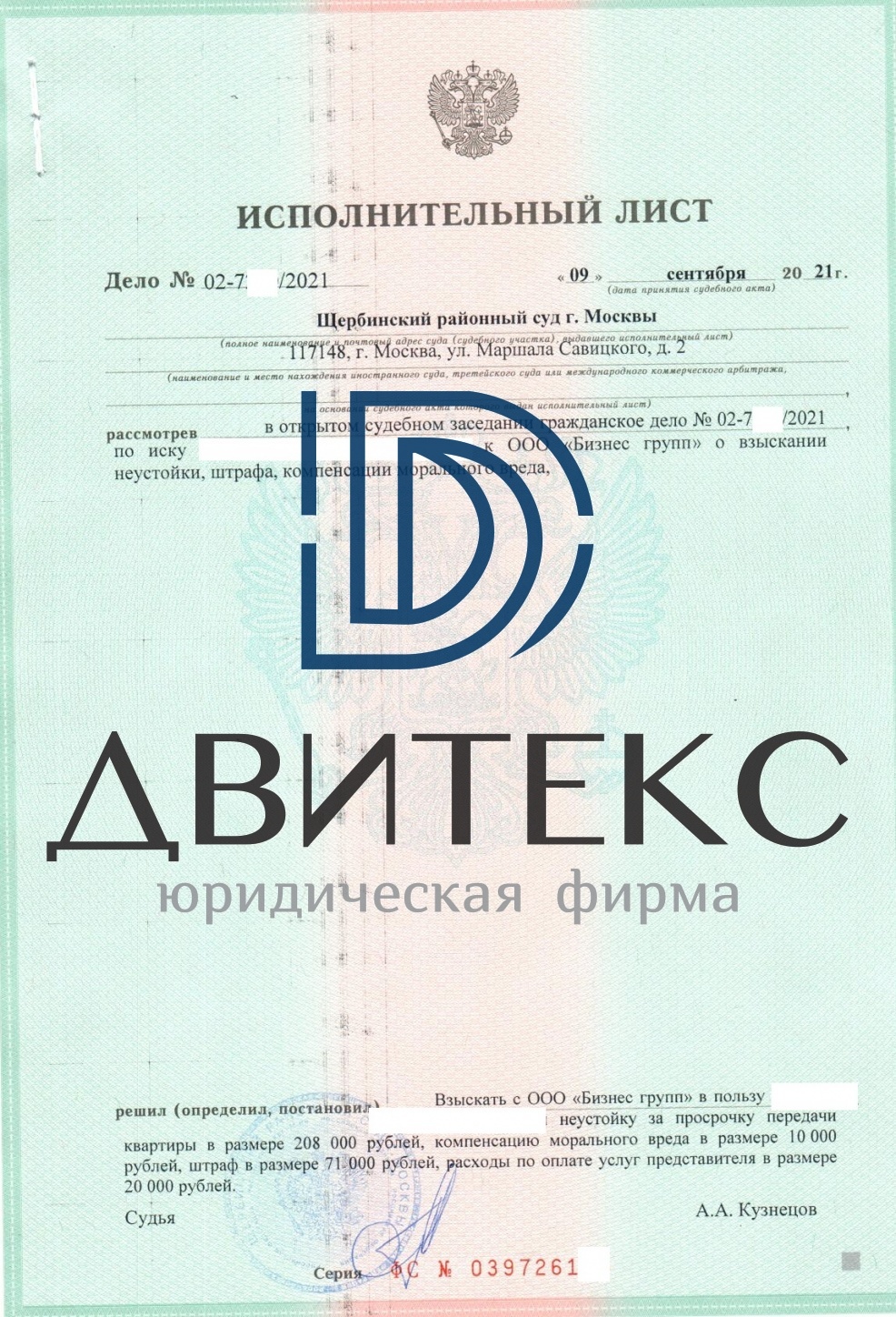 Юристы ООО Юридическая фирма "Двитекс" подготовили необходимые документы и обратились в суд, представили интересы клиентов в суде. Результатом рассмотрения дела явилось взыскание в пользу клиента неустойки, штрафа, компенсации морального вреда, а также судебных расходов с застройщика ООО "БИЗНЕС ГРУПП" (ЖК "Филатов Луг"). Всего взыскано 309 000 рублей. Деньги поступили клиенту на счет от застройщика.