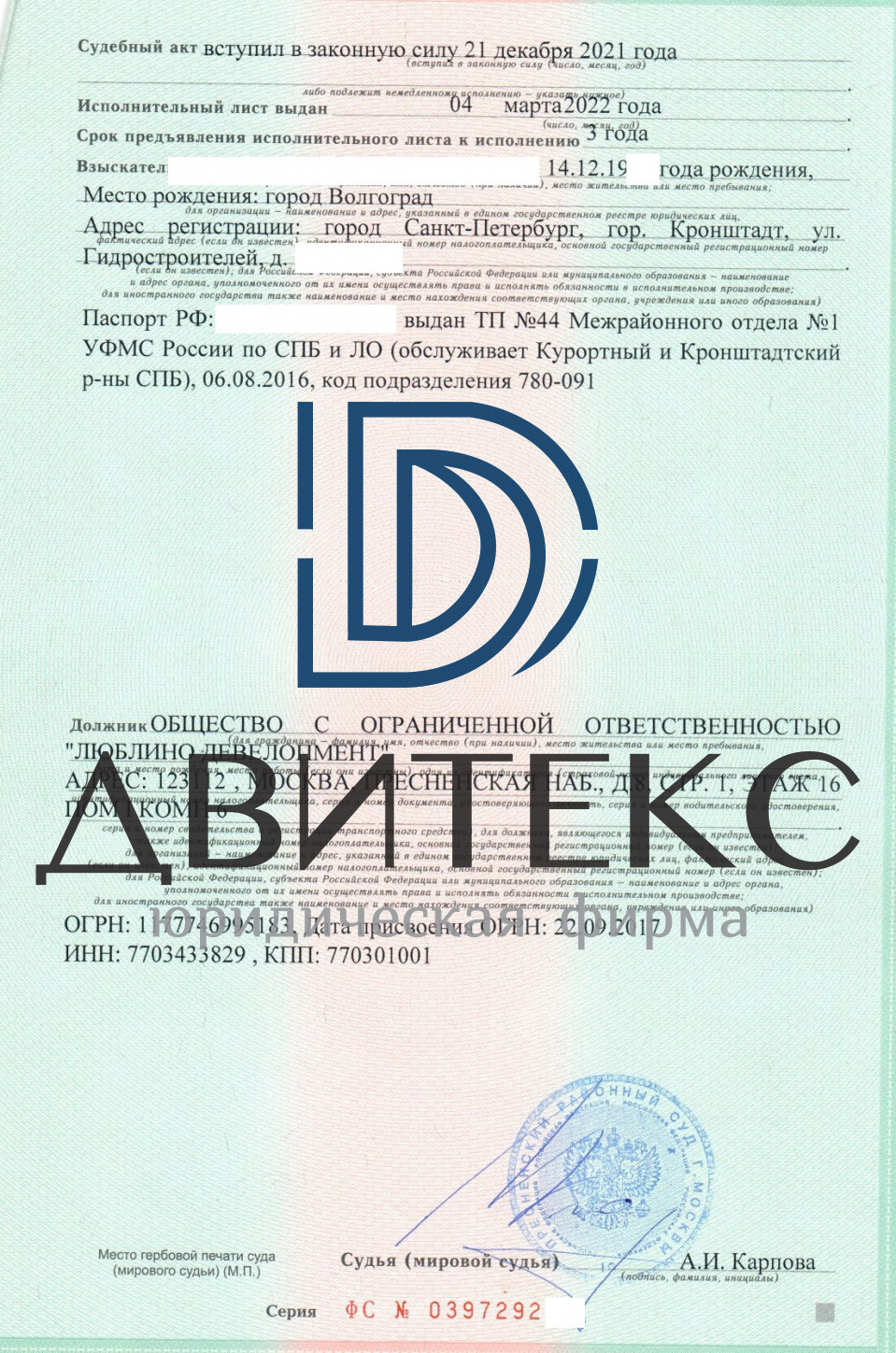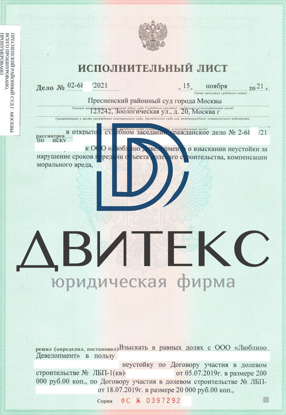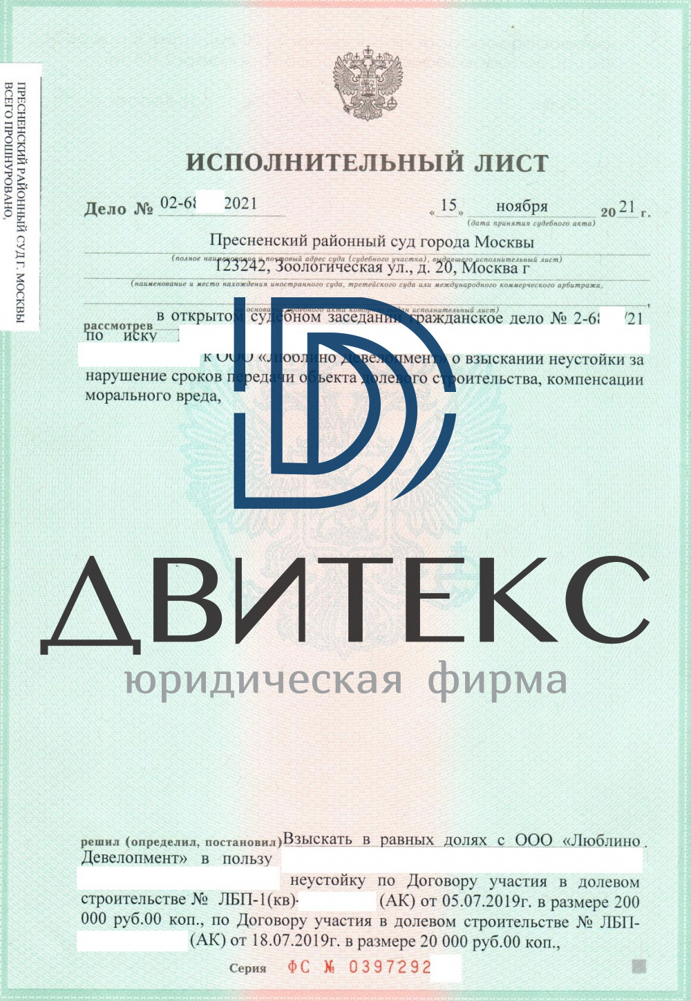 Юристы ООО Юридическая фирма "Двитекс" подготовили необходимые документы и обратились в суд, представили интересы клиентов в суде. Результатом рассмотрения дела явилось взыскание в пользу клиента неустойки, штрафа, компенсации морального вреда, а также судебных расходов с застройщика ООО "ЛЮБЛИНО ДЕВЕЛОПМЕНТ" (ЖК "Люблинский парк"). Всего взыскано 297 500 рублей. Деньги поступили клиенту на счет от застройщика.