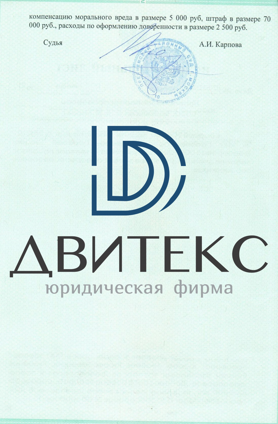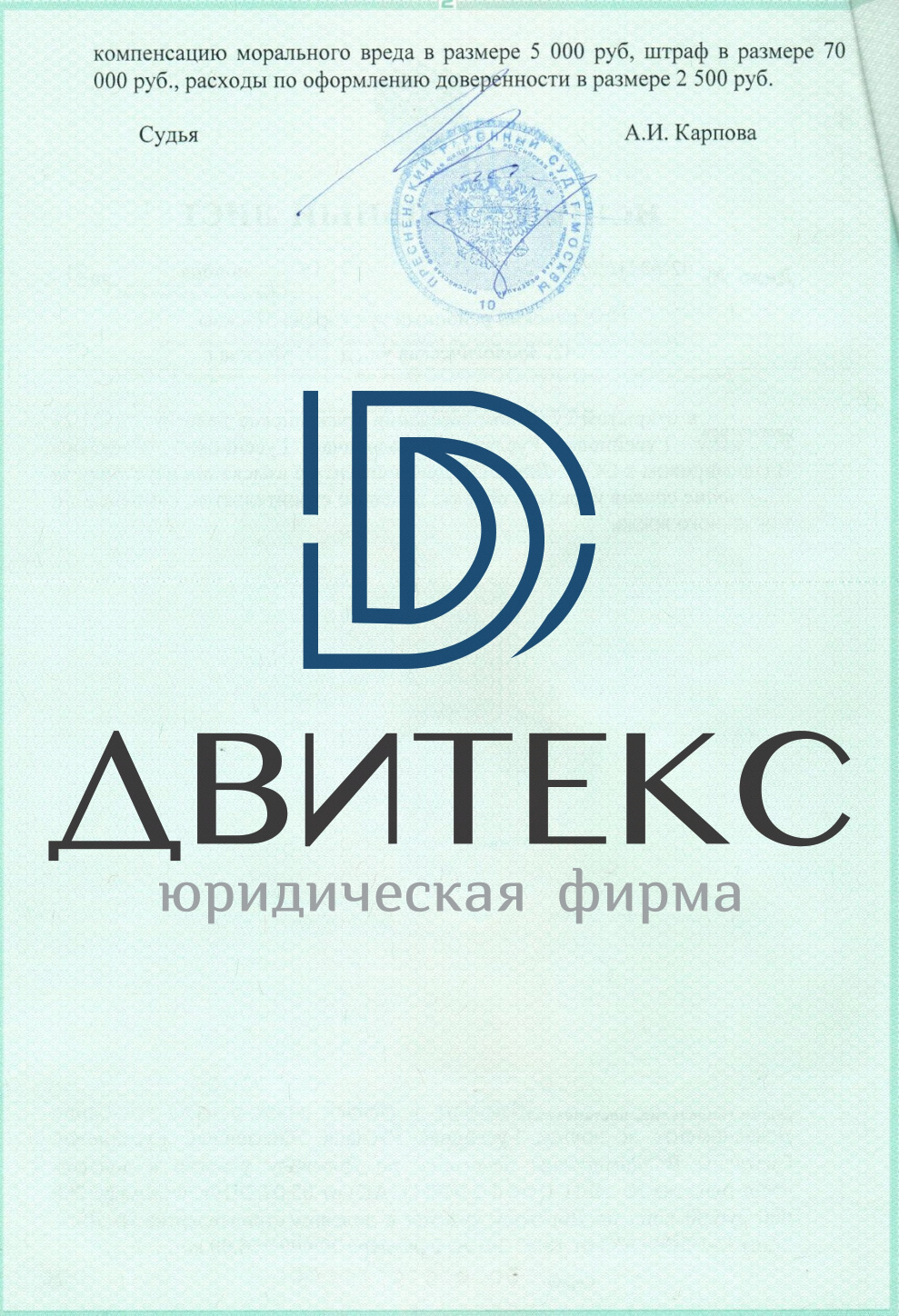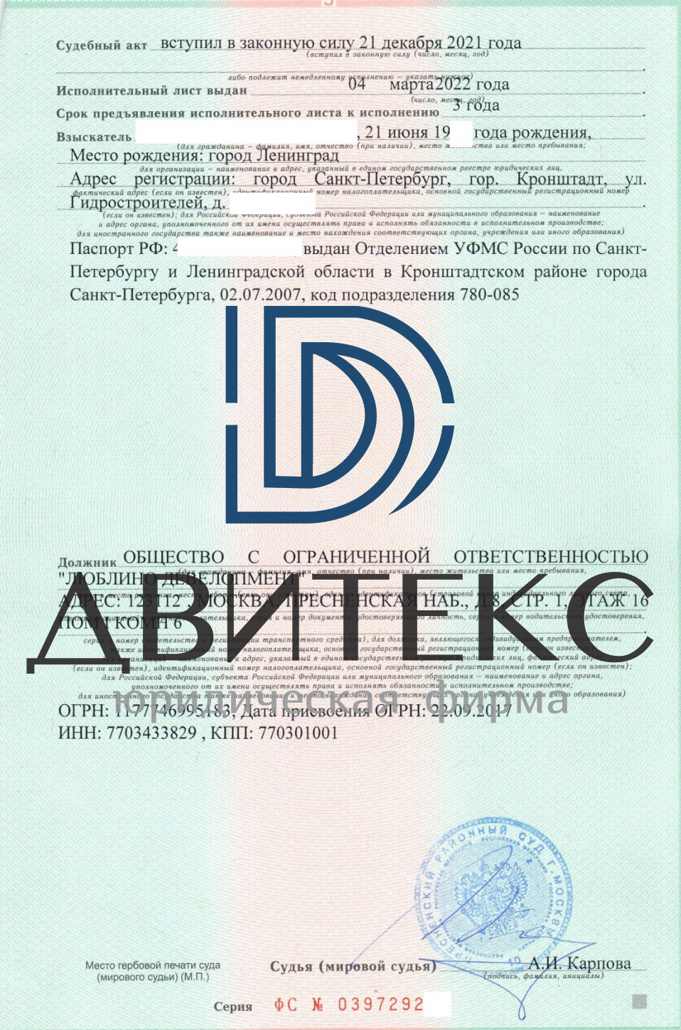 Юристы ООО Юридическая фирма "Двитекс" подготовили необходимые документы и обратились в суд, представили интересы клиентов в суде. Результатом рассмотрения дела явилось взыскание в пользу клиента неустойки, штрафа, компенсации морального вреда, а также судебных расходов с застройщика ООО "ЛЮБЛИНО ДЕВЕЛОПМЕНТ" (ЖК "Люблинский парк"). Всего взыскано 297 500 рублей. Деньги поступили клиенту на счет от застройщика.