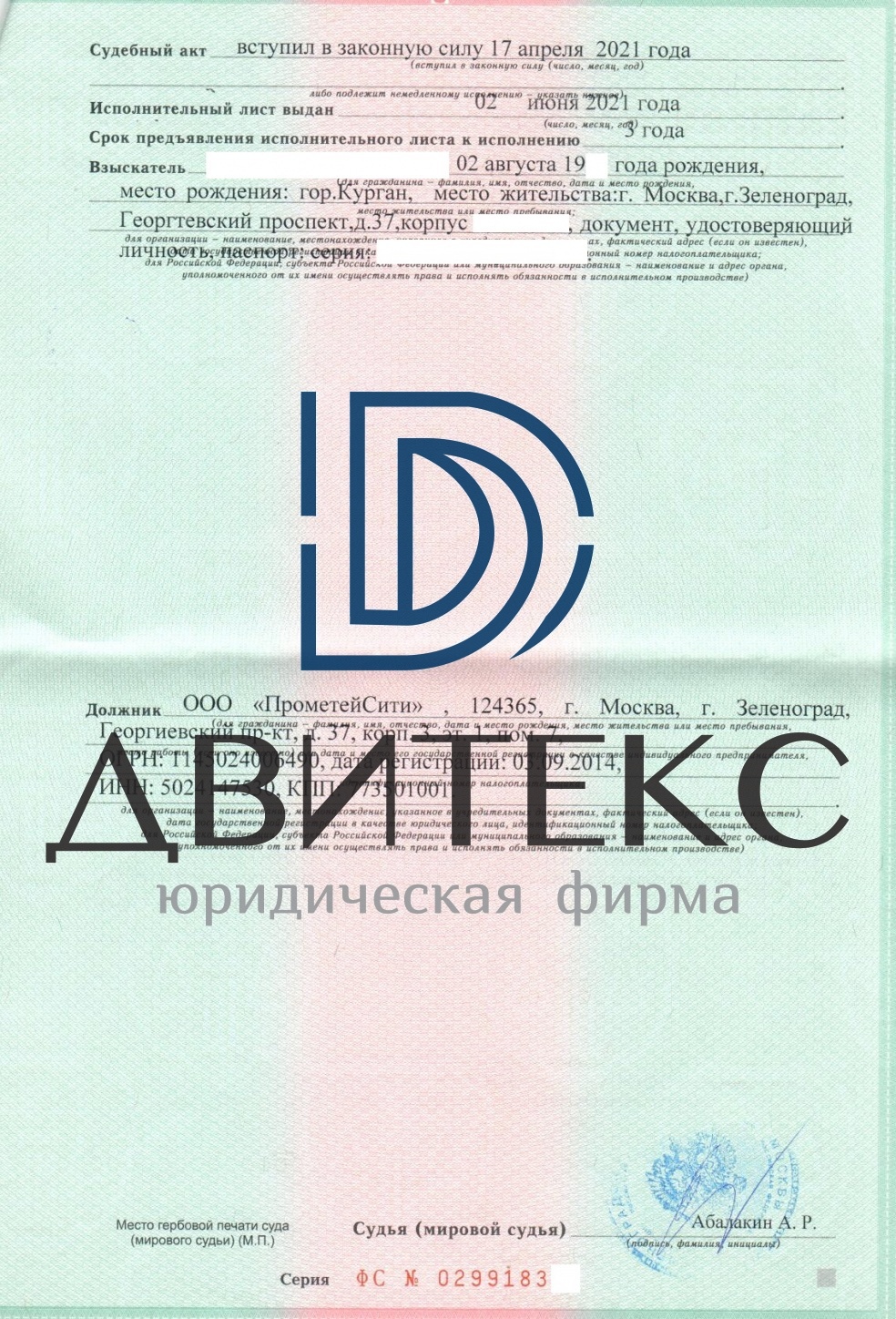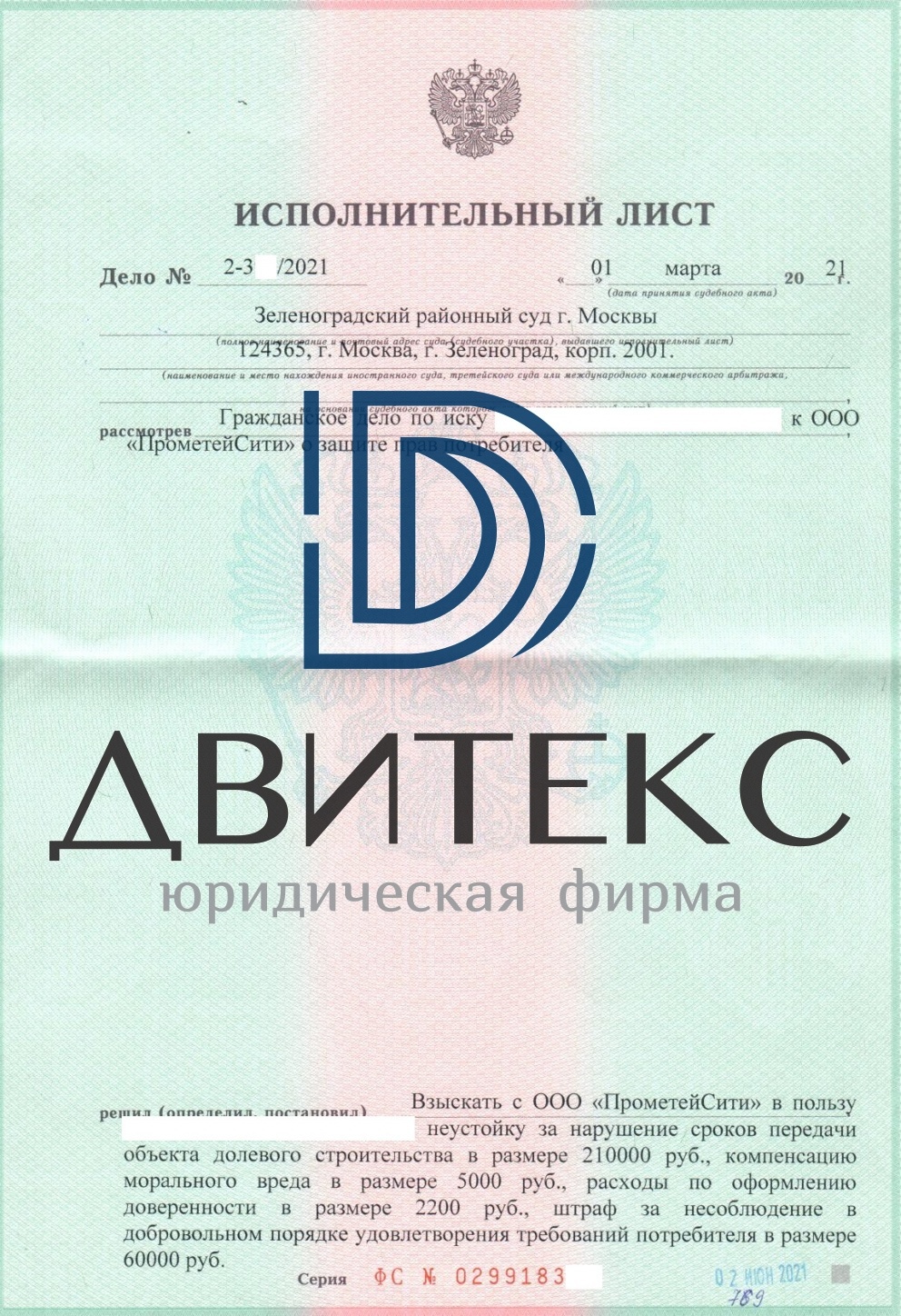Юристы ООО Юридическая фирма "Двитекс" подготовили необходимые документы и обратились в суд, представили интересы клиентов в суде. Результатом рассмотрения дела явилось взыскание в пользу клиента неустойки, штрафа, компенсации морального вреда, а также судебных расходов с застройщика ООО "Прометей Сити" (ЖК "Жемчужина Зеленограда"). Всего взыскано 277 200 рублей. Деньги поступили клиенту на счет от застройщика.