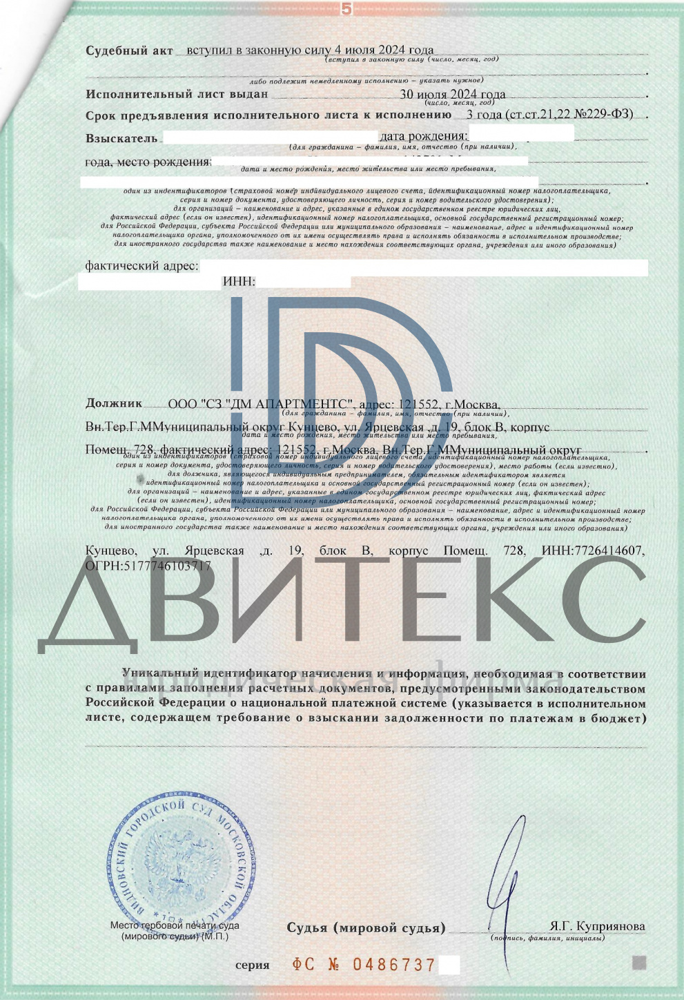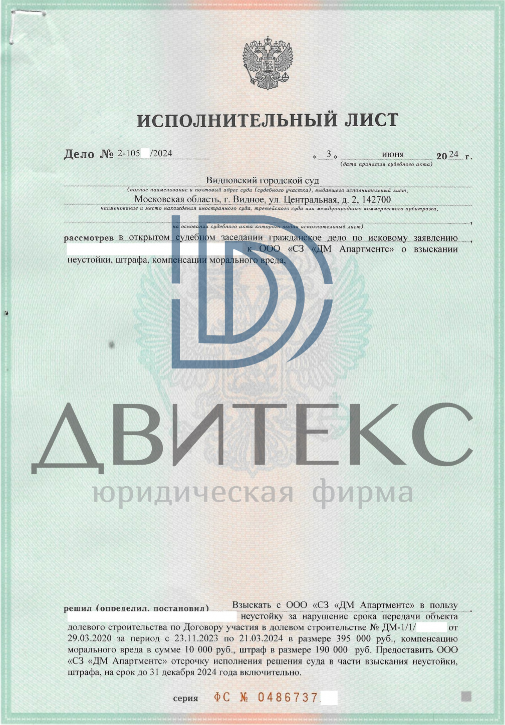 Результат нашей работы по взысканию неустойки с ООО "СЗ "ДМ АПАРТМЕНТС" в Видновском городском суде Московской области: