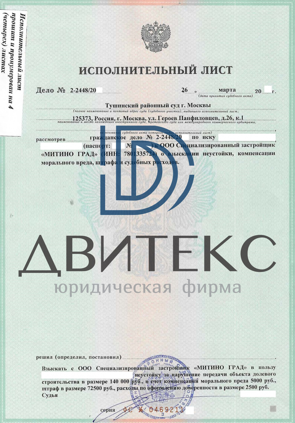 Результат нашей работы по взысканию неустойки с ООО "СЗ "МИТИНО ГРАД" в Тушинском районном суде г. Москвы: