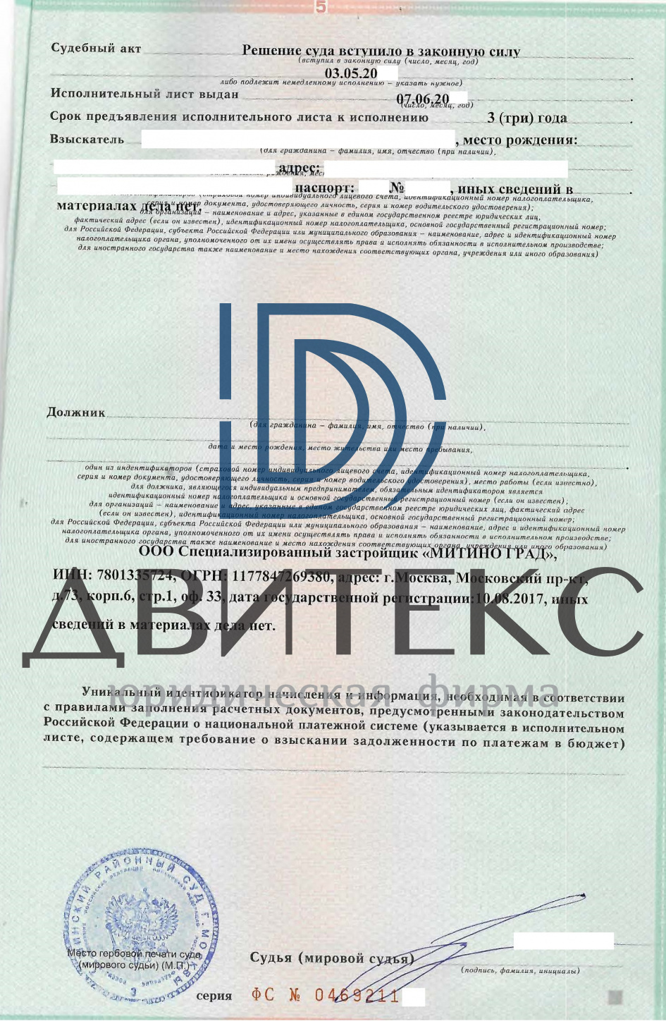 Юристы ООО Юридическая фирма "Двитекс" подготовили необходимые документы и обратились в суд, представили интересы клиентов в суде. Результатом рассмотрения дела явилось взыскание в пользу клиента неустойки, штрафа, компенсации морального вреда, а также судебных расходов с застройщика ООО "СЗ "МИТИНО ГРАД" (ЖК "Аквилон Митино"). Всего взыскано 220 000 руб. Деньги поступили клиенту на счет от застройщика.
