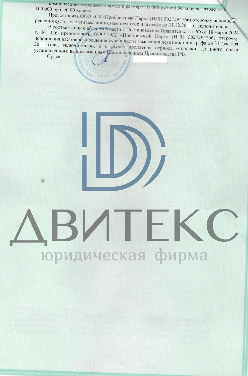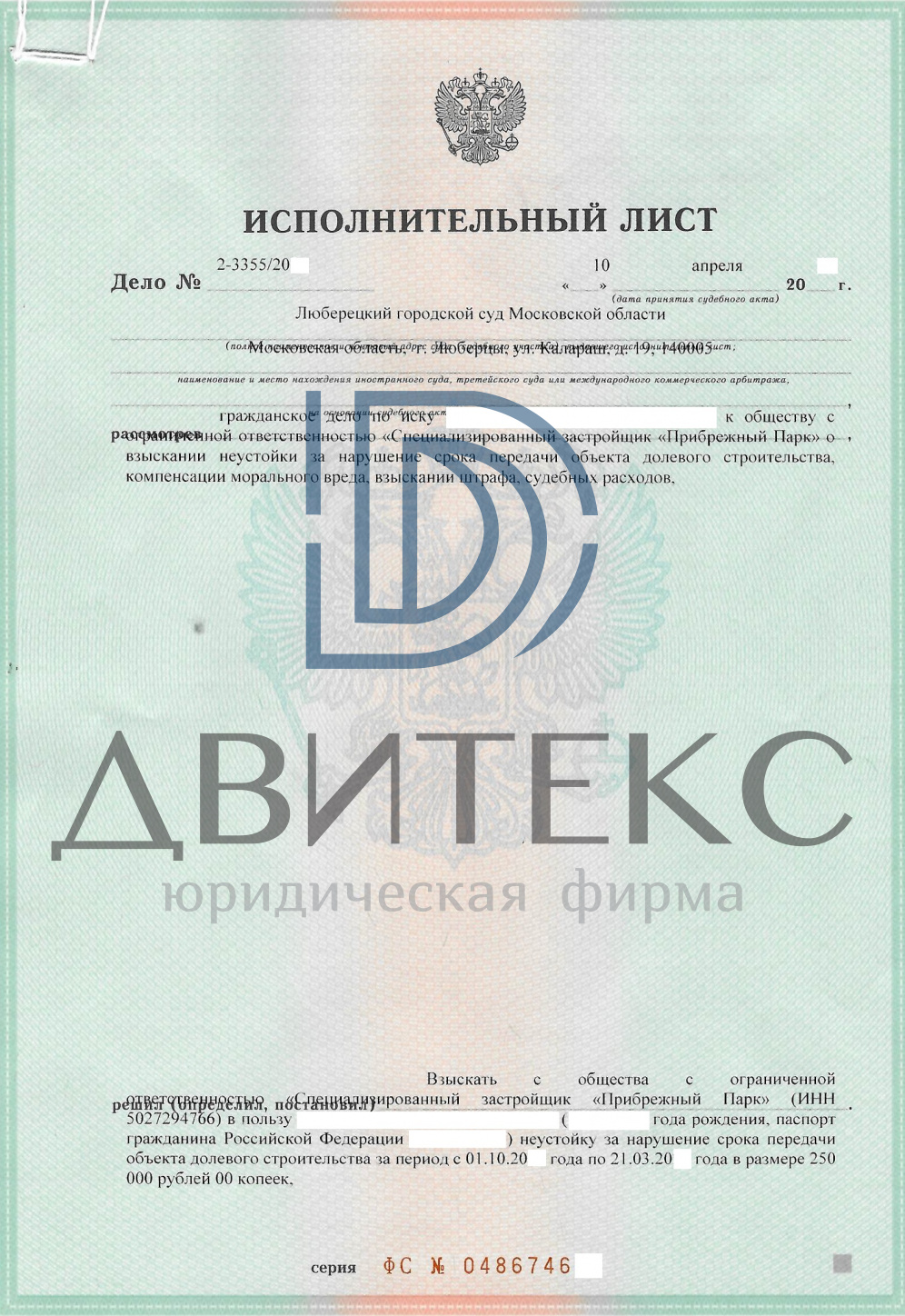 Результат нашей работы по взысканию неустойки с ООО "СЗ Прибрежный парк" в Люберецком городском суде Московской области: