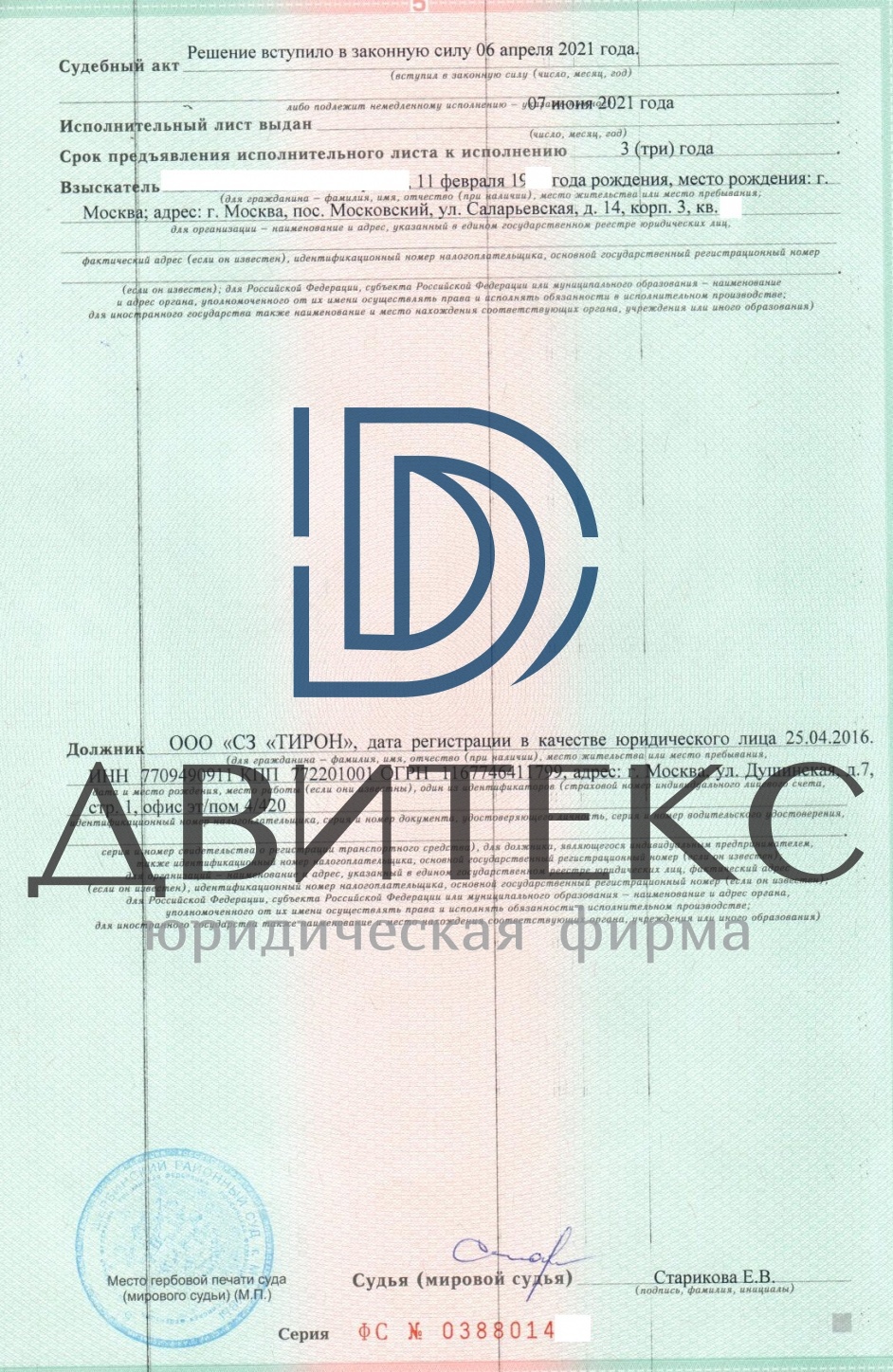 Юристы ООО Юридическая фирма "Двитекс" подготовили необходимые документы и обратились в суд, представили интересы клиентов в суде. Результатом рассмотрения дела явилось взыскание в пользу клиента неустойки, штрафа, компенсации морального вреда, а также судебных расходов с застройщика ООО "Тирон" (ЖК "Саларьево парк"). Всего взыскано 218 400 рублей. Деньги поступили клиенту на счет от застройщика.