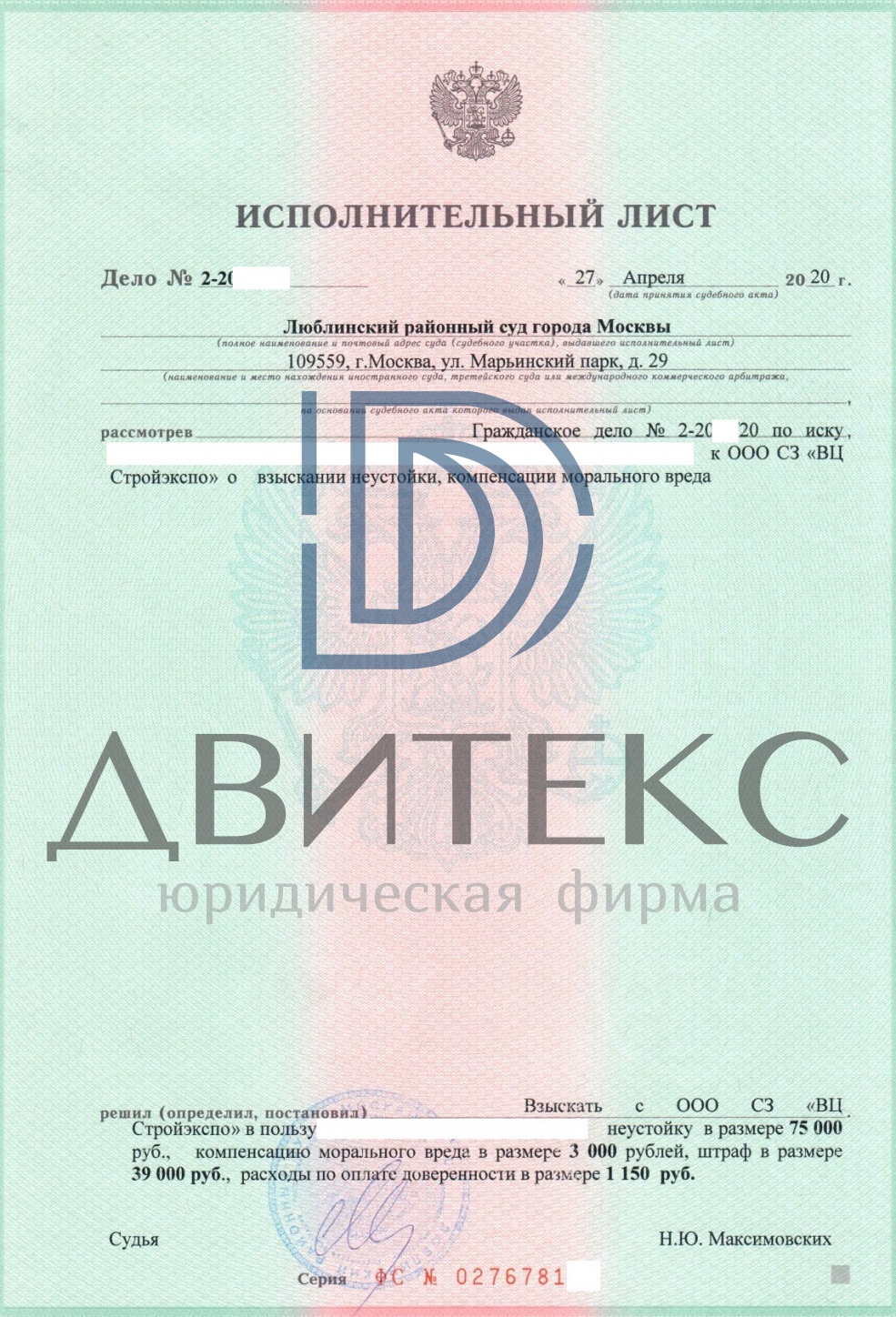Юристы ООО Юридическая фирма "Двитекс" подготовили необходимые документы и обратились в суд, представили интересы клиентов в суде. Результатом рассмотрения дела явилось взыскание в пользу клиента неустойки, штрафа, компенсации морального вреда, а также судебных расходов с застройщика ООО "ВЦ Стройэкспо" (ЖК "Среда"). Всего взыскано 236 300 руб. Деньги поступили клиенту на счет от застройщика. Частично расходы на оплату услуг юриста были взысканы с застройщика.