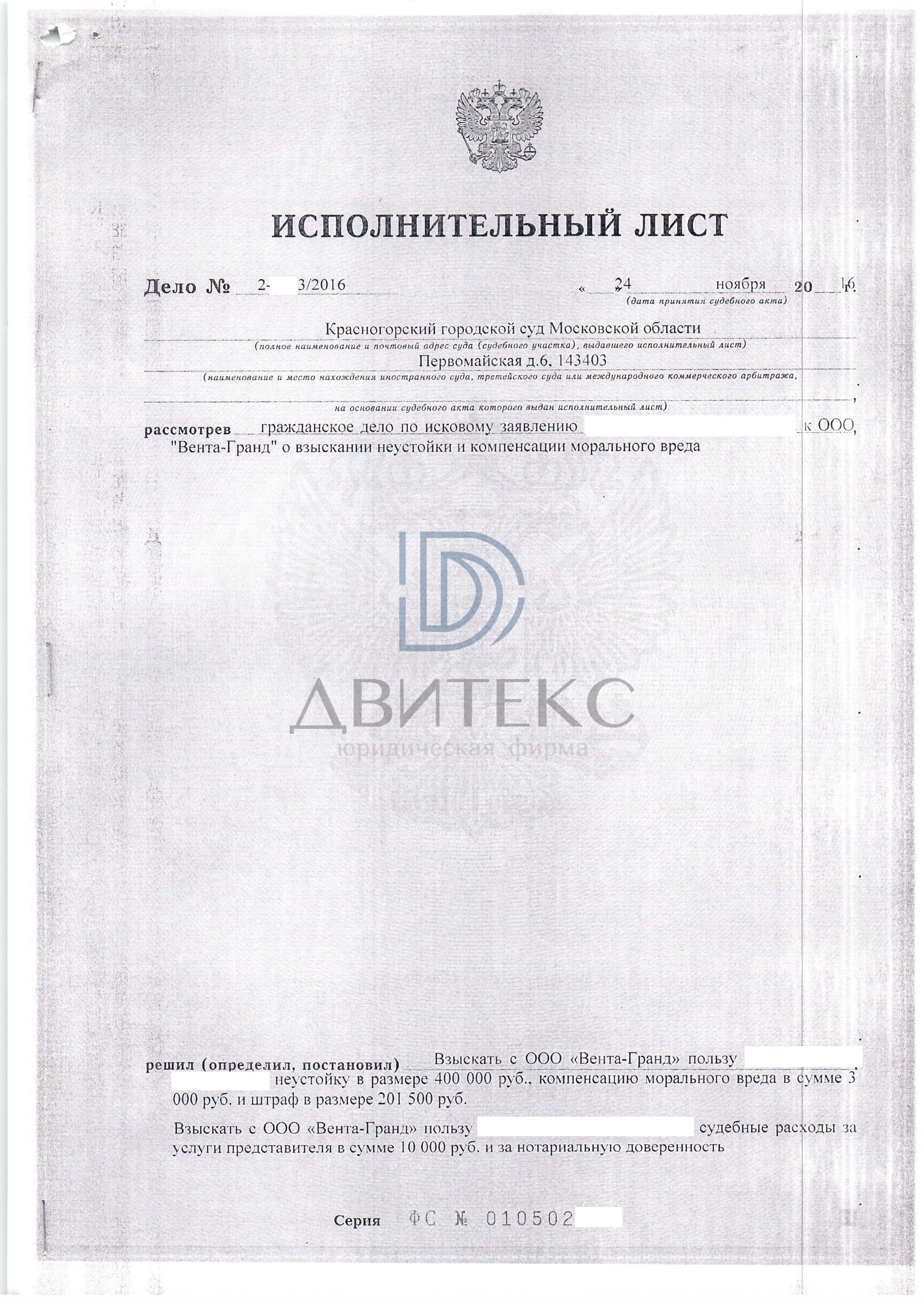 Юристы ООО Юридическая фирма «Двитекс» подготовили необходимые документы и обратились в суд, представили интересы клиентов в суде. Результатом рассмотрения дела явилось вынесение решения судом о взыскании неустойки в размере 400 000 рублей, штрафа в размере 201 500 рублей, морального вреда в размере 3 000 рублей с ООО «Вента-Гранд».