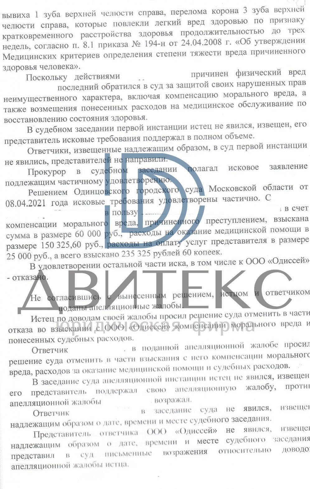 Юристы «Двитекс» с проанализировали ситуацию, собрали и подготовили необходимые документы, а также защитили интересы доверителя в суде первой и апелляционной инстанции. Всего по делу состоялось 6 судебных заседаний. Суд первой инстанции удовлетворил исковые требования. Однако взысканная судом первой инстанции сумма не соответствовала желаемой, поэтому юристы "Двитекс" подготовили апелляционную жалобу и защитили интересы доверителя в вышестоящем суде. Суд апелляционной инстанции изменил решение суда в части взысканной компенсации морального вреда и судебных расходов. Результатом нашей работы явилось взыскание с причинителя вреда в пользу Клиента расходов на медицинскую помощь в размере 150 325,60 рублей, компенсации морального вреда в размере 80 000 рублей, расходов на оплату услуг представителя в размере 35 000 рублей.